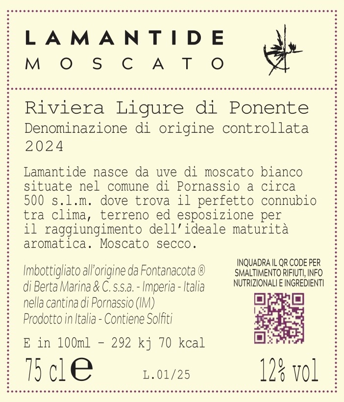 Lamantide nasce da uve di moscato bianco, coltivate a Pornassio, a 500 metri slm, dove trova il perfetto connubio tra clima, terreno ed esposizione per il raggiungimento dellβideale maturitΓ aromatica.